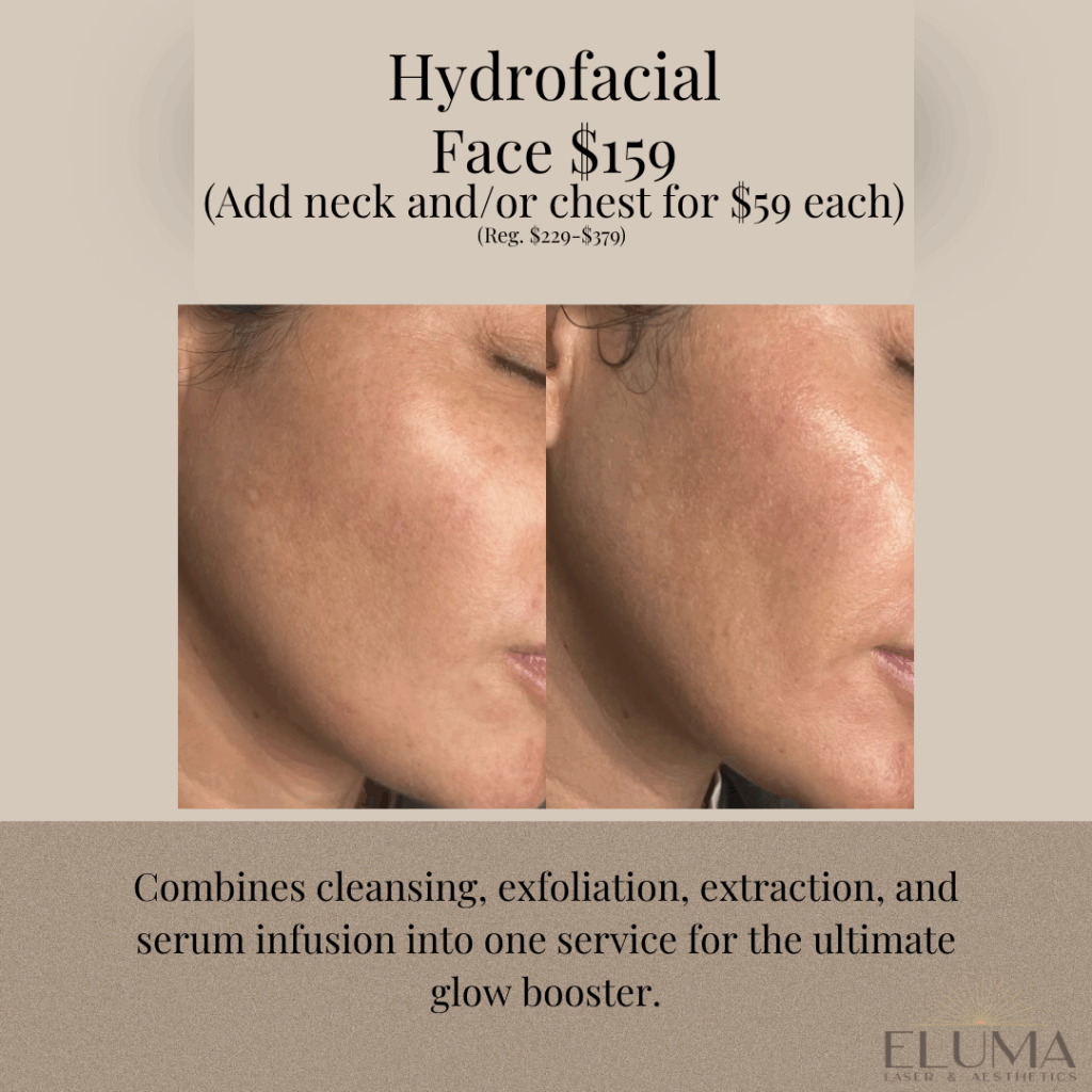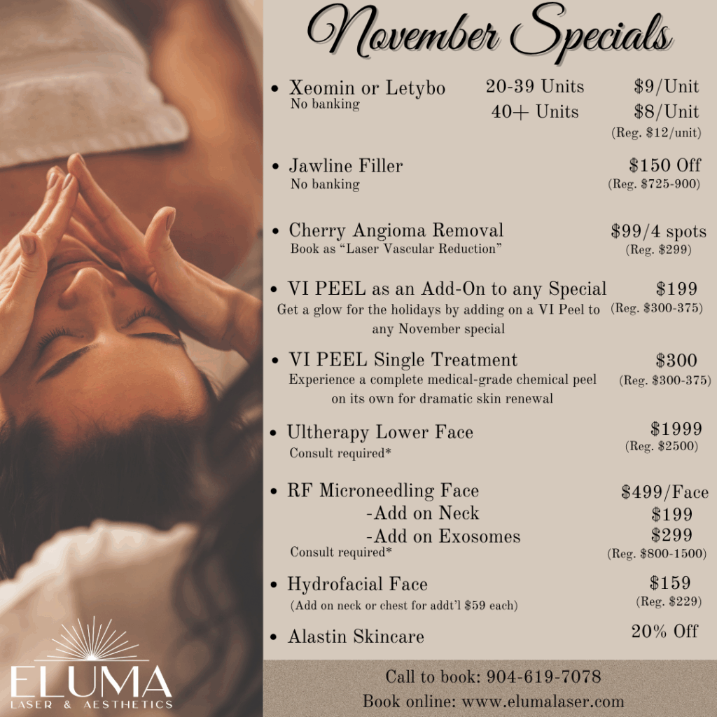 This November, Eluma Laser & Aesthetics is celebrating radiant renewal with fall exclusive specials designed to refresh, hydrate and tighten. Just in time for the holidays. Whether you’re brightening with a VI Peel, lifting with Ultherapy or restoring hydration with our Harvest Hydration HydroFacial, every treatment is crafted to help you look and feel your best this season.
